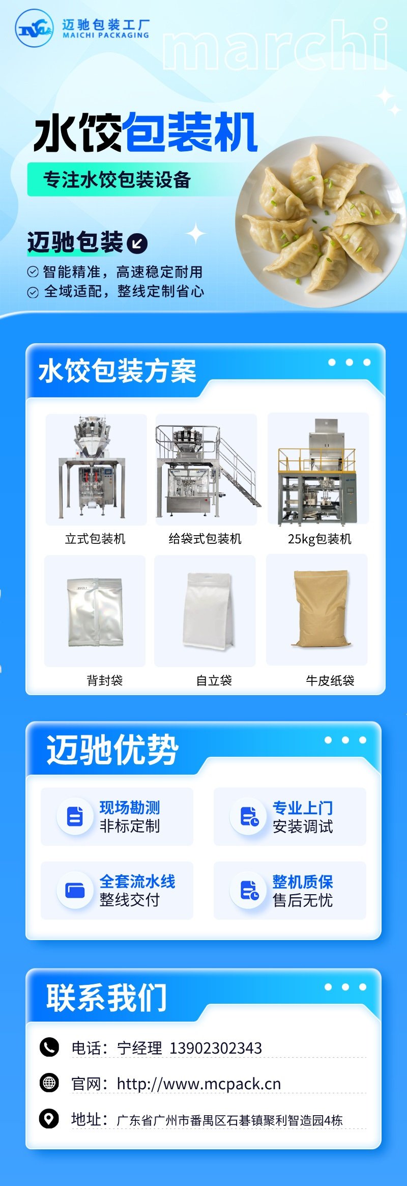 如需進一步了解速(sù)凍水餃包裝機的選型建議、技術參數(shù)及現場安裝(zhuāng)服務,歡迎聯係(xì)廣州邁馳包裝設備有限公司(sī)或合肥邁馳包裝設備有限公司(sī),獲取專業包裝解決方案。