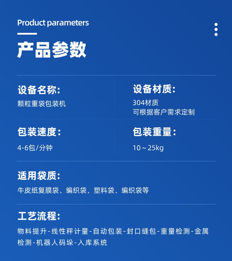 這條先進的生產線能夠包裝多種顆粒狀產品,包括動物飼料、肥料、塑料顆粒、氯化鈉、碳酸鈣、催化劑和活(huó)性(xìng)炭顆粒等。其包裝速度可達到每分鍾4-6袋,包(bāo)裝範圍覆蓋10-50kg,滿(mǎn)足不同(tóng)客戶的需求,充分展現了生產線的靈活(huó)性。
